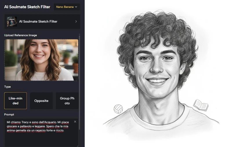 BananaImg Soulmate Sketch Filter offre tre modalità diverse: partner simile, partner complementare e foto di coppia.