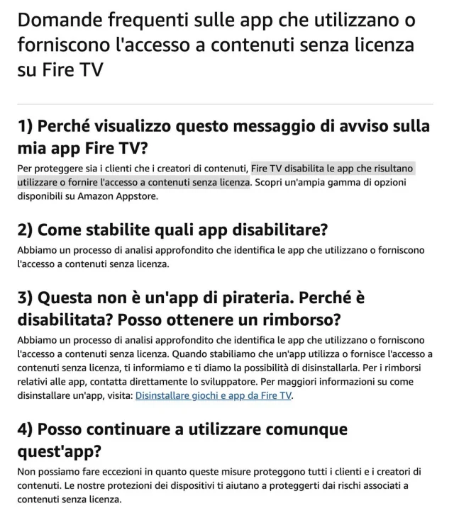 “Fire TV disabilita le app che risultano utilizzare o fornire l’accesso a contenuti senza licenza.”
