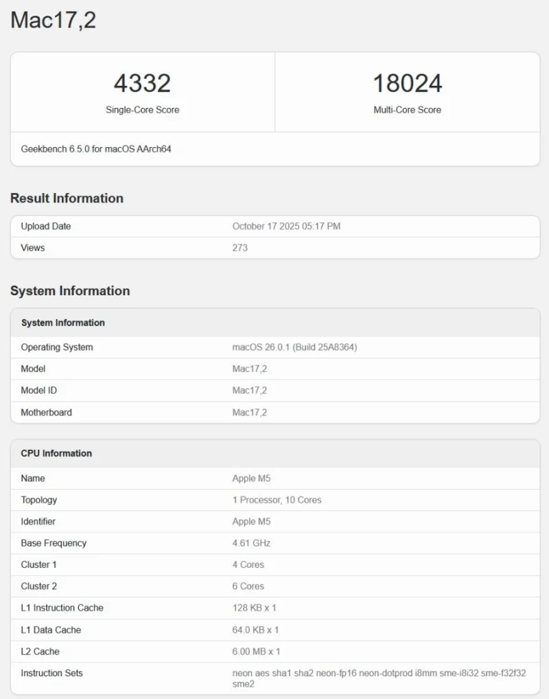 Secondo i dati preliminari, il chip M5 mantiene l’architettura 10-core (CPU e GPU) ma introduce miglioramenti significativi nella gestione energetica e nel caching interno.