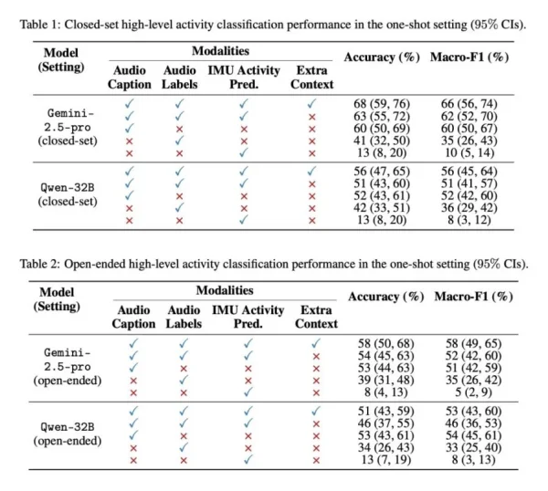 In entrambi gli scenari, i risultati sono stati sorprendentemente alti, con una precisione fino al 58% anche senza input visivi. Per l’activity recognition è un dato notevole: è come chiedere a una persona di capire cosa sta accadendo in una stanza… senza poterla vedere.