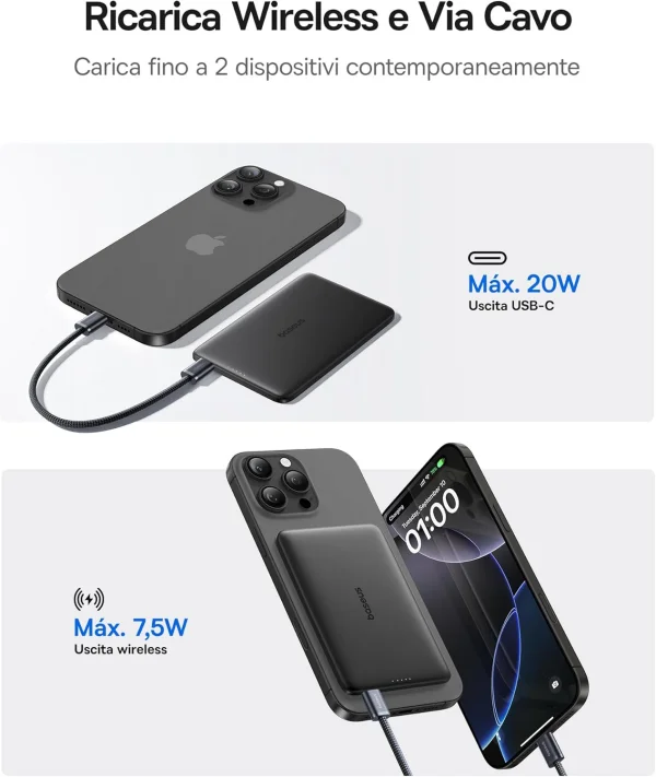 - 【Piccolo nelle Dimensioni, Potente nella Capacità】Con una capacità di 5000mAh, il powerbank iphone magnetico di Baseus può ricaricare l’iPhone in modalità wireless fino a 7,5W o caricarlo al 55% in soli 30 minuti tramite la porta USB-C da 20W, offrendo opzioni di ricarica rapide ed efficienti, particolarmente utili quando si è in viaggio.