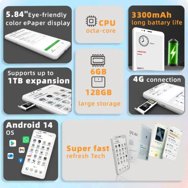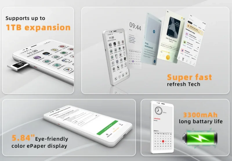 Questa volta, però, l’approccio è completamente diverso. Hibreak S non vuole essere un e-reader camuffato, ma un vero e proprio smartphone. Ha un modulo 4G pienamente funzionante non solo per navigare, ma anche per effettuare chiamate vocali, il tutto supportato da Android 14. Un piccolo dispositivo pensato per chi vuole usare il telefono in modo più tranquillo, riducendo l’affaticamento visivo e la dipendenza dalla luminosità dello schermo tradizionale.