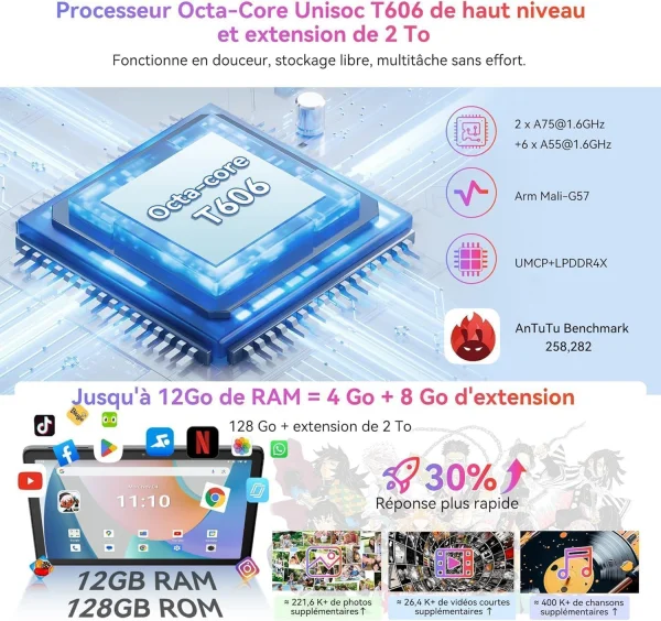 Sotto la scocca troviamo il processore Unisoc T606 octa-core, perfetto per multitasking, giochi leggeri e streaming in alta qualità.