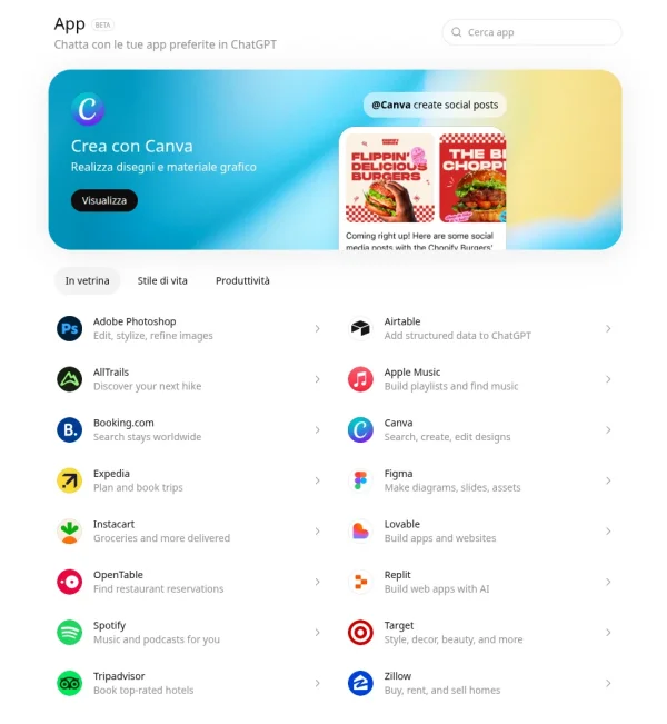 L’elenco completo delle applicazioni disponibili è consultabile nel menu laterale di ChatGPT oppure direttamente in questo indirzzo: https://chatgpt.com/apps