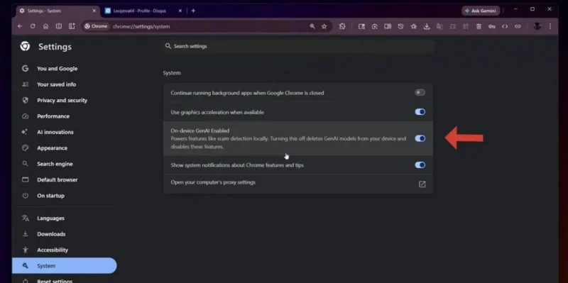 Nella versione beta di Chrome, all’interno delle impostazioni di Sistema, è già visibile un nuovo interruttore che permette di disattivare il modulo AI associato alla Protezione avanzata. La funzione di sicurezza di base resta attiva, ma senza il livello di analisi automatizzata affidato all’intelligenza artificiale.