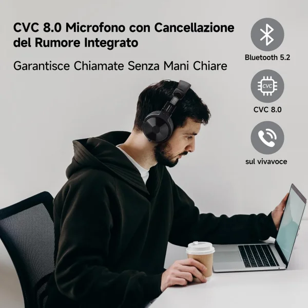 Grazie al microfono integrato con tecnologia CVC 8.0 e Bluetooth 5.2, puoi effettuare chiamate in totale libertà, con riduzione del rumore unidirezionale e connessione stabile e veloce. Perfette per lavorare da remoto o partecipare a riunioni online, si collegano facilmente a PC, smartphone, tablet e molto altro.