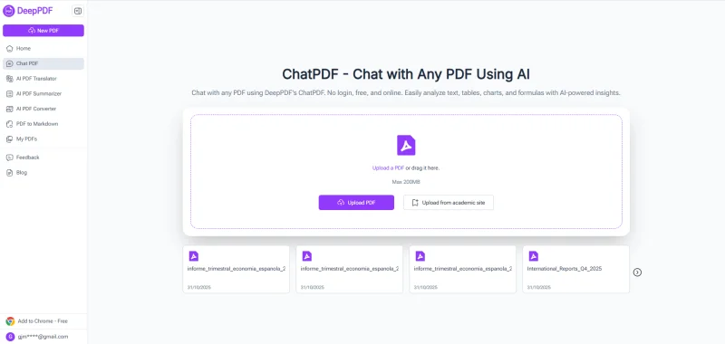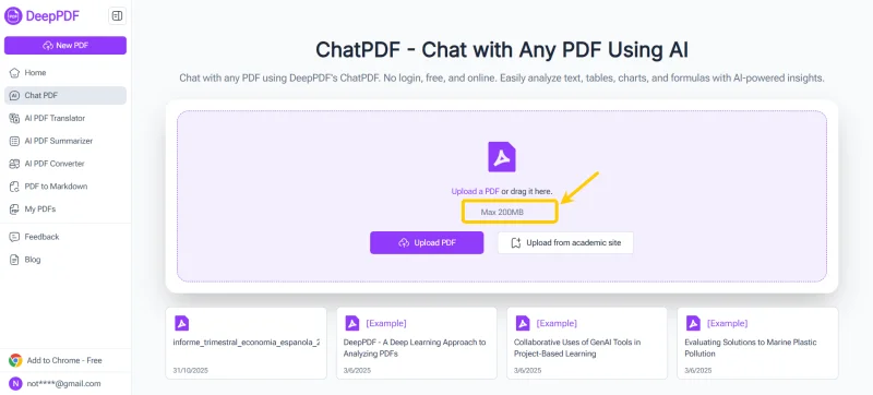 DeepPDF ChatPDF supports PDFs up to 200MB, meaning you can upload entire dissertations, e-books, or technical manuals without splitting them.