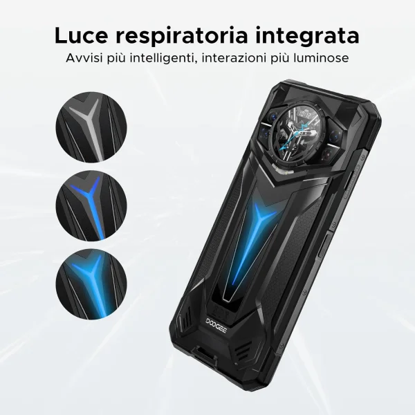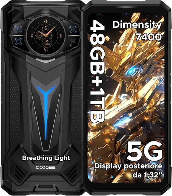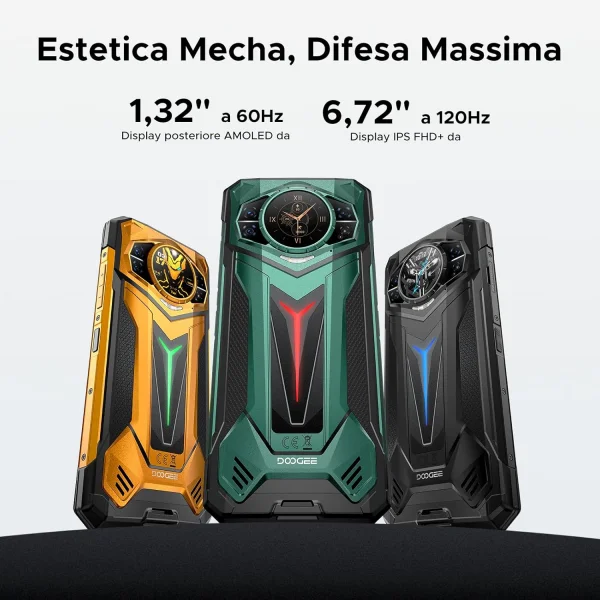 Il Doogee S200 Ultra eredita l’inconfondibile estetica “mech-inspired” che ha reso celebre la serie, ma la porta a un nuovo livello. Linee spigolose, scocca rinforzata, bordi antiurto e una presa salda anche con i guanti: è costruito per resistere a tutto.