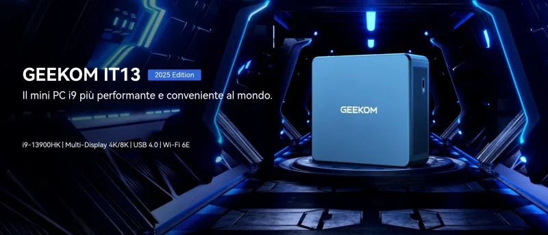 Il GEEKOM IT13 2025 Edition (Intel Core i9-13900HK, 32 GB RAM, 1 TB SSD) è pensato per i carichi di lavoro più pesanti. Monta un potente Intel Core i9 di 13ª generazione, supporta fino a quattro display e vanta un design elegante e robusto.