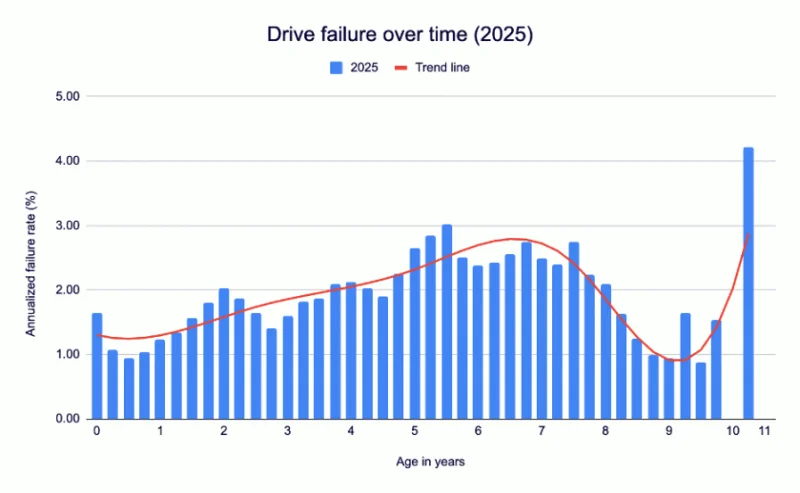Per decenni, l’affidabilità degli HDD è stata rappresentata dalla classica “curva a vasca da bagno”: molti guasti nei primi mesi, un lungo periodo di stabilità e poi un nuovo aumento con l’usura.