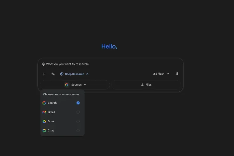 Quando un utente attiva la ricerca approfondita, Gemini chiede di scegliere quali fonti utilizzare: la normale ricerca Google, Gmail, Drive e persino Google Chat.