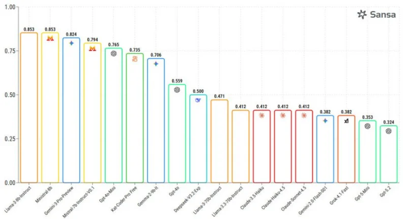 Il Censorship Reference Score di Sansa Bench misura quanto spesso una rete neurale rifiuta di rispondere alle richieste degli utenti. Più alto è il punteggio, minori sono le restrizioni. GPT-5.2 ha ottenuto appena 0,324 punti, piazzandosi all’ultimo posto della classifica. Un distacco netto rispetto a modelli concorrenti: GPT-4o Mini ha raggiunto 0,765, mentre Gemini 3 Pro Preview è salito fino a 0,824. Il leader assoluto? Llama 3 8B-Instruct, con un notevole 0,853.