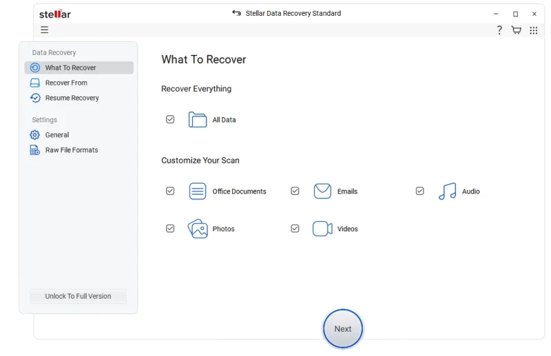 Open the software and select what type of data you want to recover, documents, photos, videos, emails, or all files.