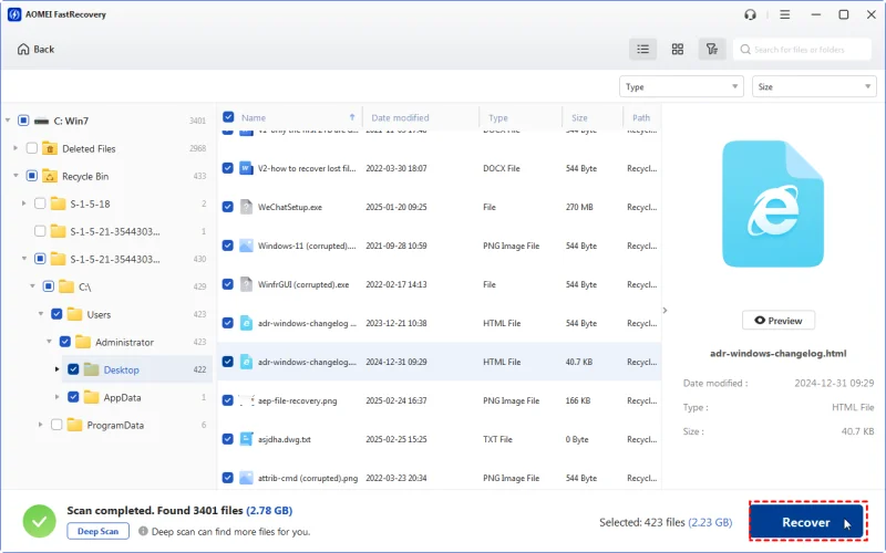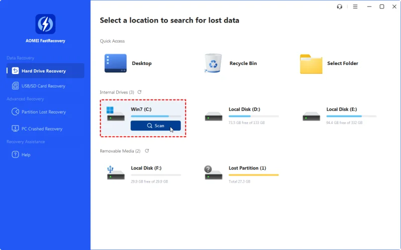 If you don’t have a backup yet, you may need a powerful file recovery software –AOMEI FastRecovery to help you recover lost files. It provides comprehensive Windows data recovery solutions for all users, covering accidental deletion, Recycle Bin clearance, disk formatting, and system breakdowns.