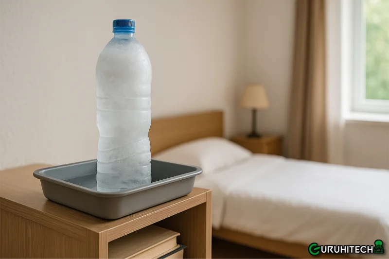 Il metodo è tanto semplice quanto efficace. Ti serve solo una bottiglia di plastica – meglio se grande – riempita d’acqua e messa in congelatore fino a diventare un blocco di ghiaccio. Poi va posizionata in alto, su un armadio, una libreria o una mensola. Sotto, basta mettere una bacinella per raccogliere l’acqua che si formerà con la condensa.