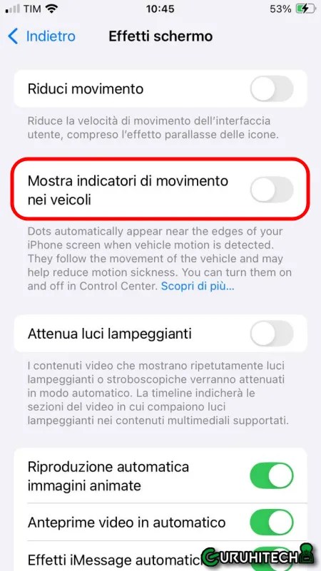 Mentre il tuo iPhone si muove, anche i puntini opzionali sullo schermo si muovono, ed è tutto qui. Ma è sufficiente. Se sei soggetto al mal d’auto, di solito questo viene peggiorato dalla lettura di uno schermo invece che dal guardare fuori dal finestrino dell’auto o del treno. Il problema è il disconnesso tra lo schermo fisso che i tuoi occhi vedono e il movimento fisico del veicolo che il tuo corpo e la tua testa stanno sperimentando. Posizionando puntini in movimento sullo schermo, i tuoi occhi vedono il movimento che il tuo corpo sta percependo.