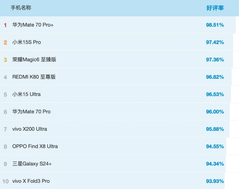 Tra i primi dieci della classifica, solo un dispositivo non cinese riesce a entrare: il Samsung Galaxy S24+, che si piazza al nono posto con un solido 94,34% di recensioni positive. Non male, considerando la concorrenza agguerrita dei brand orientali. Ma sorprende che il suo fratello maggiore, Galaxy S25 Ultra, si trovi solo al 14° posto. Evidentemente, anche in casa Samsung, il prezzo elevato e le prestazioni top non bastano per garantire la massima soddisfazione.