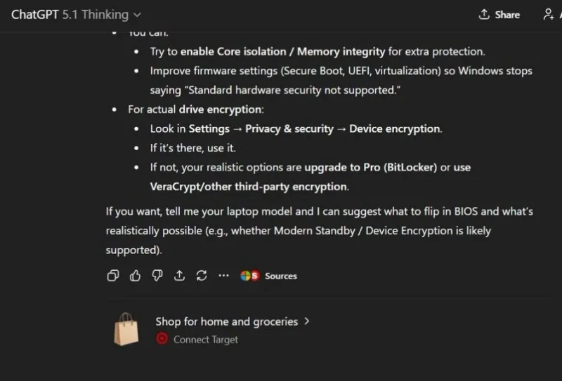 La miccia l’ha accesa un utente di X, Benjamin De Kraker, che ha condiviso uno screenshot emblematico. Aveva chiesto a ChatGPT una spiegazione su Windows BitLocker, ma nella risposta si è ritrovato davanti un link per acquistare prodotti alimentari da Target, la catena di supermercati statunitense. Una dissonanza talmente assurda da risultare quasi comica, se non fosse che si tratta di un servizio a pagamento. L’episodio è rimbalzato da un profilo all’altro con rapidità, attirando l’attenzione di migliaia di utenti e sollevando dubbi sulla direzione commerciale intrapresa da OpenAI.