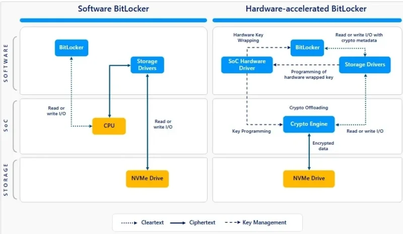 Microsoft parla chiaro: i cicli CPU necessari per le operazioni I/O si riducono in media del 70% rispetto alla precedente implementazione software. Non è un’ottimizzazione marginale, ma un salto prestazionale che può fare la differenza su notebook aziendali, workstation e sistemi sempre cifrati per policy di sicurezza.