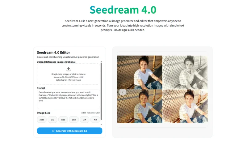 Designed for professional creators, Seedream 4.0 combines text-to-image and photo editing in one engine. It supports up to five input images, multi-image generation, and consistent visual style — all in just 1.8 seconds per 2K image.