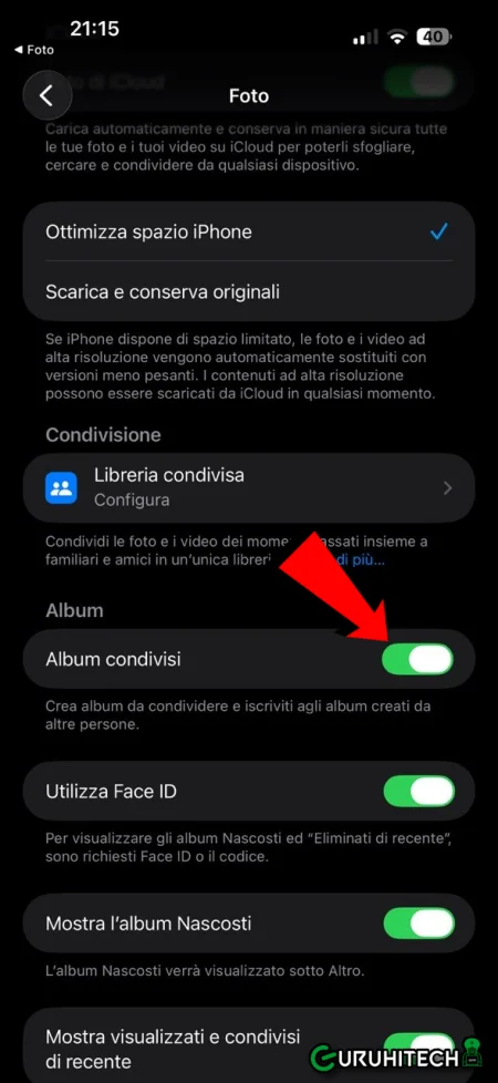 Cliccando su “Inizia condivisione” verrai rimandato nelle impostazioni, dove dovrai abilitare la funzione “Album condivisi“