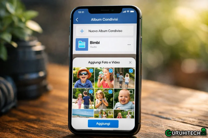 Il secondo metodo è ancora più diretto. Entra direttamente nell’album condiviso appena creato e tocca Aggiungi foto. Da lì puoi selezionare immagini e video dalla libreria e inserirli immediatamente nell’album. È il sistema più rapido se stai organizzando tutto per categorie.