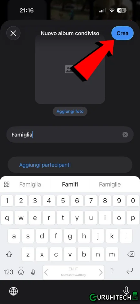 Ora, per creare un album condiviso, In alto troverai il simbolo “+”. Premilo per creare un nuovo album condiviso e assegnagli il nome che preferisci. Può essere qualcosa di pratico come “Famiglia”, “Video”, “Viaggi”, oppure qualsiasi altra categoria che ti aiuti a organizzare i contenuti. Dopo aver scelto il nome, tocca Crea.