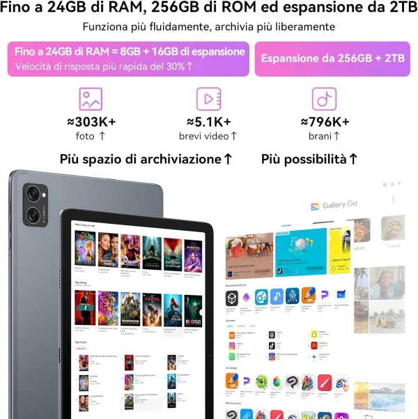 Il T20 integra 24 GB di RAM (8 GB fisici + 16 GB virtuali) e 256 GB di memoria interna, espandibili fino a 2 TB con microSD.