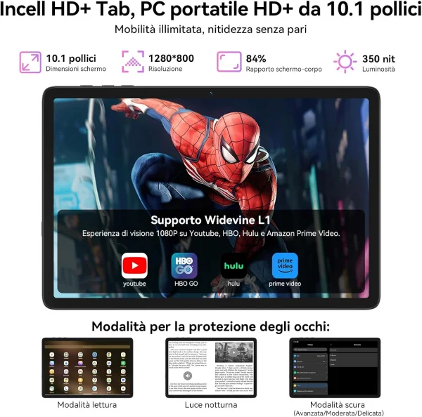 Il TABWEE T20 è certificato Widevine L1, quindi supporta streaming Full HD 1080p su YouTube, Prime Video, Disney+ e piattaforme simili.