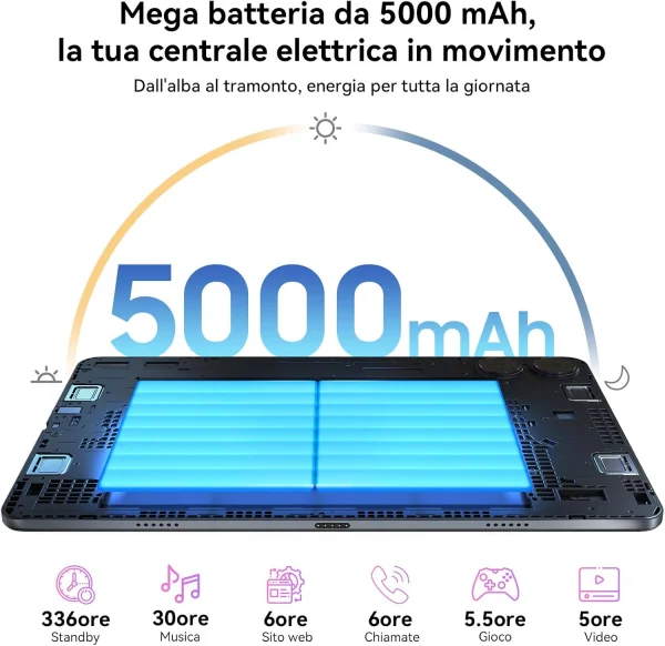 Il sistema impara come usi il tablet e riduce i consumi in background, arrivando a fino al 25% di autonomia in più rispetto a modelli simili.