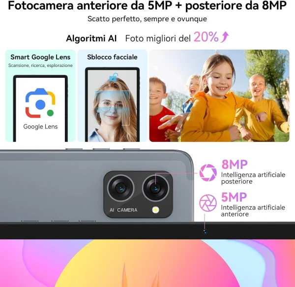 fotocamera posteriore da 8 MP con AI per migliorare automaticamente scene e colori,