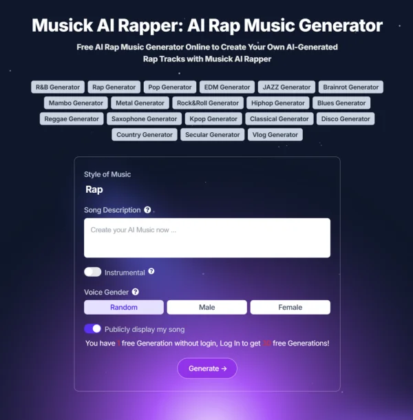 Enter the AI Rap Generator, an innovative platform designed to transform your ideas into polished, studio-grade tracks in minutes. Whether you’re a rapper, producer, or content creator, this AI-powered music maker simplifies the process without sacrificing quality or originality. It’s fast, intuitive, and fiercely creative—the perfect momentum machine for modern creators.