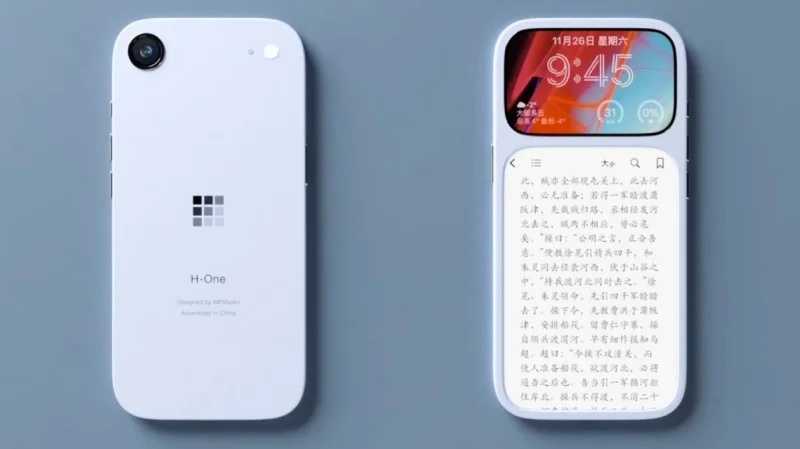 Il doppio schermo frontale apre a scenari di utilizzo difficili da ottenere sugli smartphone tradizionali. Nel concept mostrato, è possibile ad esempio riprodurre musica o controllare widget sul display IPS superiore, mentre un libro o un documento resta aperto sull’E Ink inferiore.