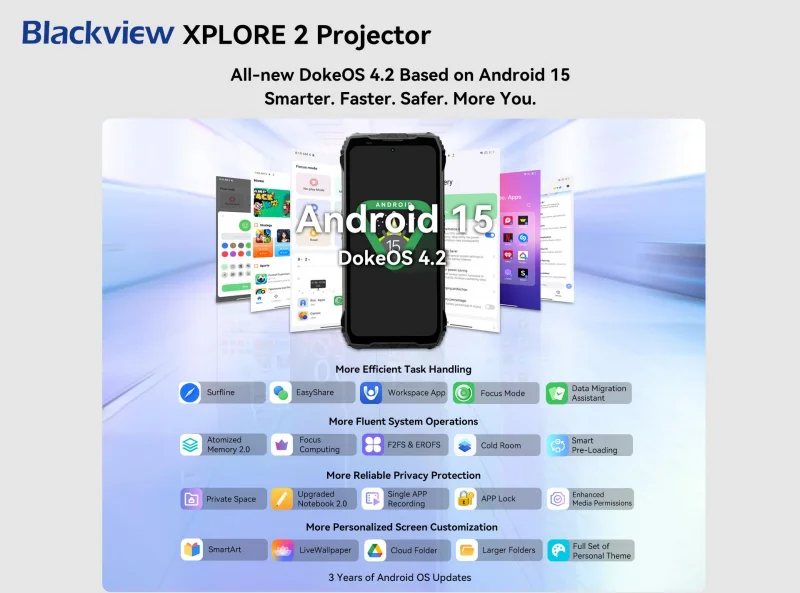 Il sistema DokeOS 4.2, sviluppato internamente da Blackview, introduce funzioni pensate per l’uso professionale: Focus Mode, Cold Room, EasyShare e Migration Assistant per una gestione più fluida e trasferimenti dati rapidi.